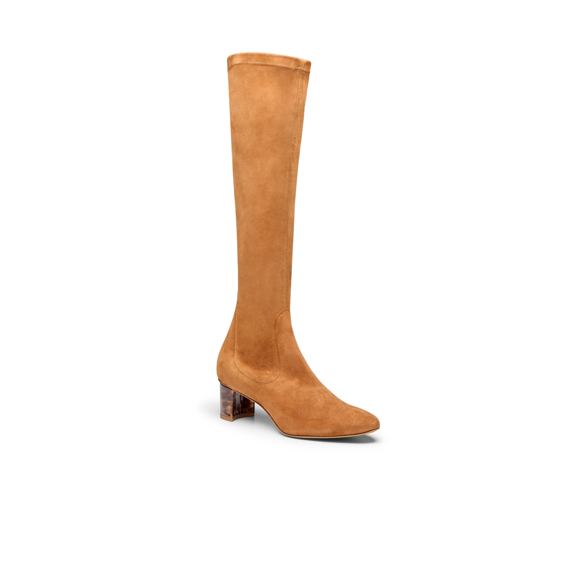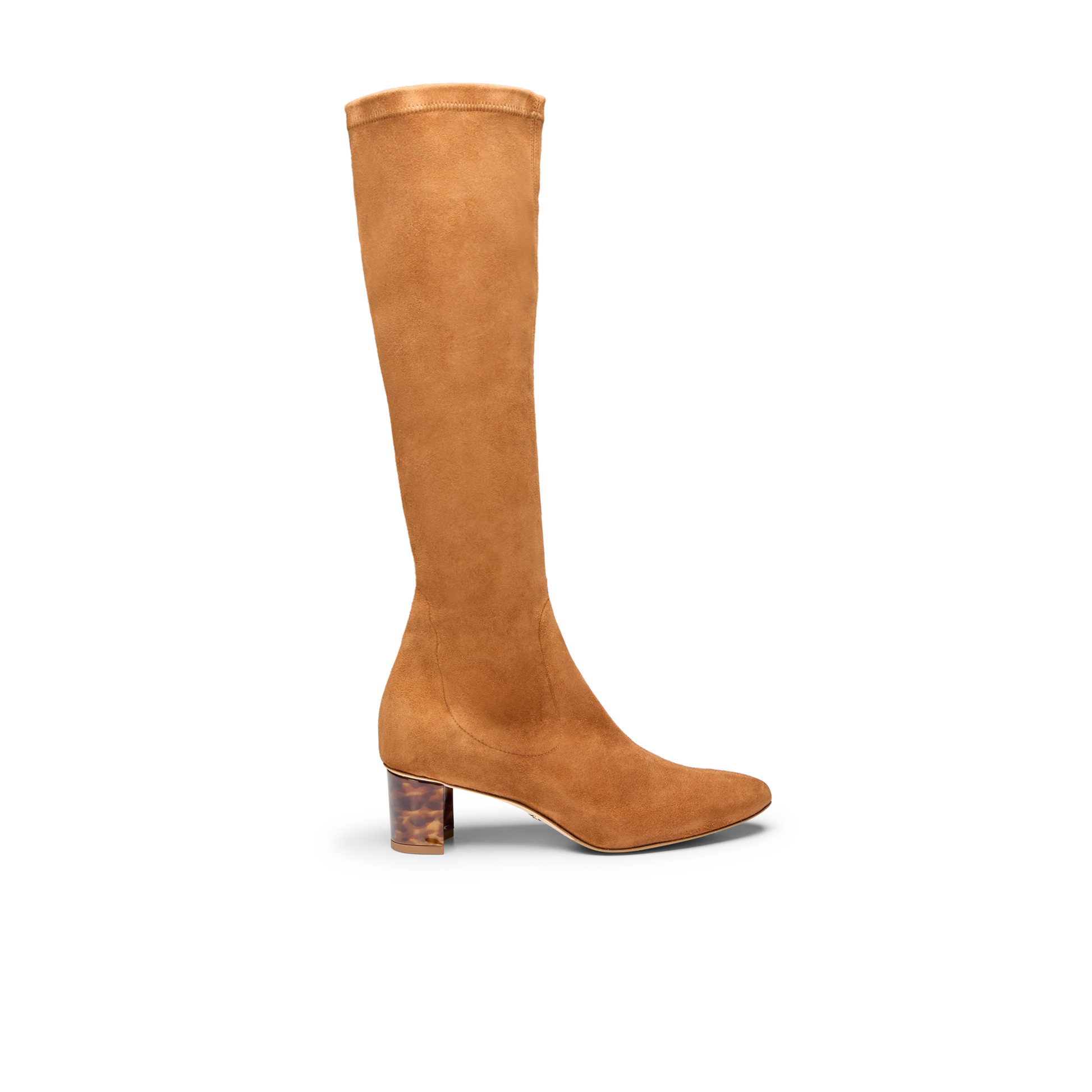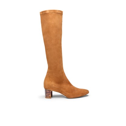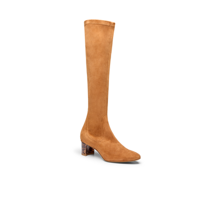 Meet the sleek, sculptural essential your fall wardrobe has been waiting for. The Alexandra Boot in cognac stretch suede hugs the calf with a smooth, form-fitting shaft that slips effortlessly under jeans or over tights. A modern take on the classic knee-high, it features a hidden interior zipper and a striking tortoise block heel for subtle shine and unexpected detail.