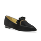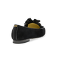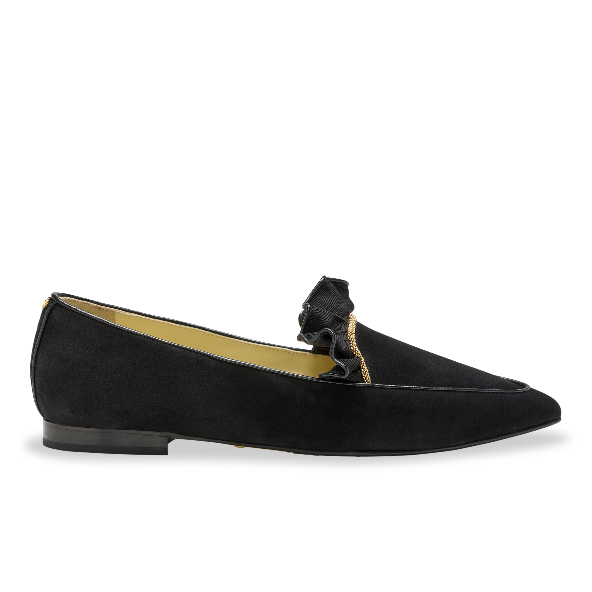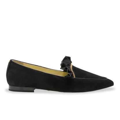 Part loafer, part smoking slipper, this pair features sleek black suede with a ruffled trim and gold chain embellishment.