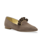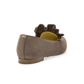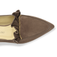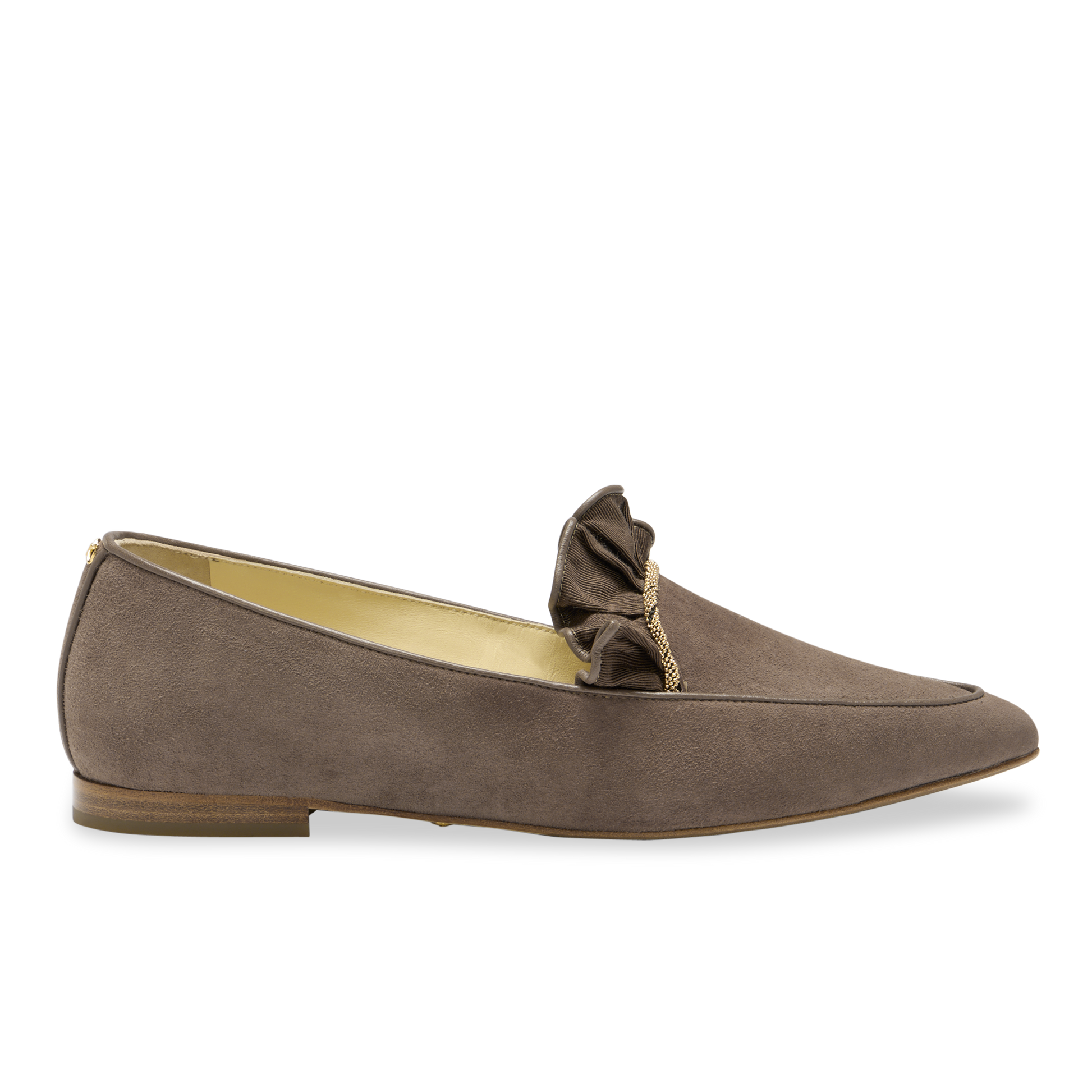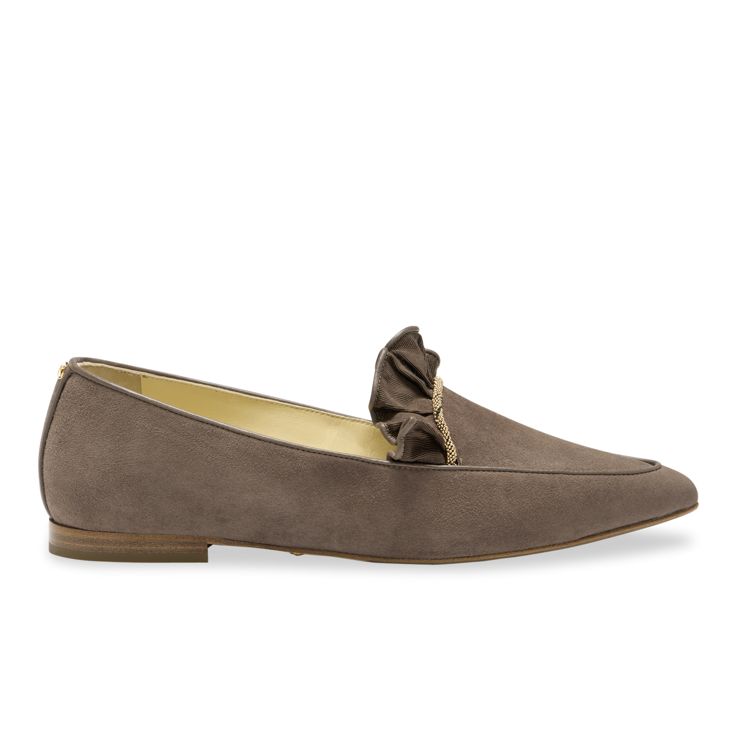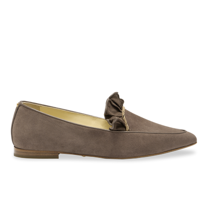 Part loafer, part smoking slipper, this pair features sleek mocha suede with a ruffled trim and gold chain embellishment.