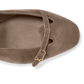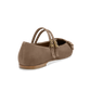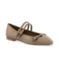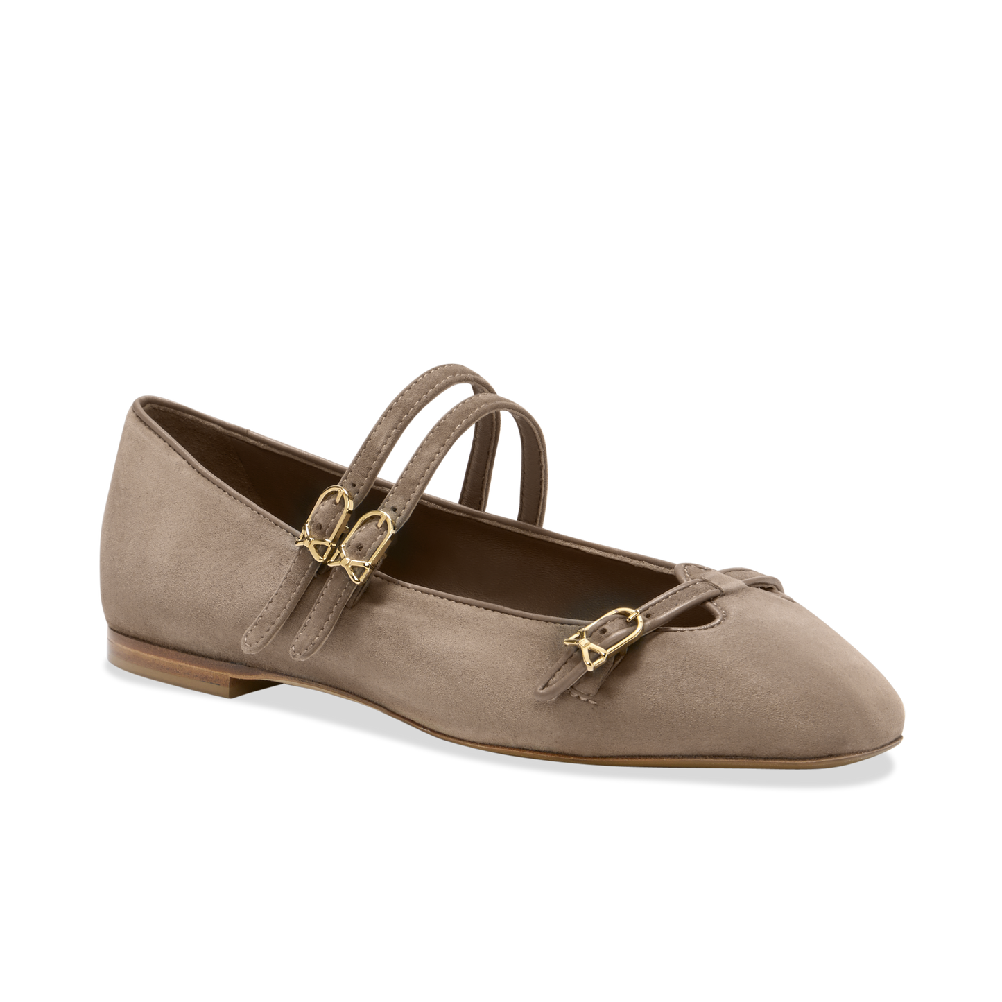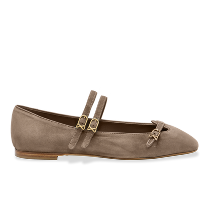 A square-toe taupe suede Mary Jane flat with three adjustable straps, made in a traditional Italian sacchetto construction.