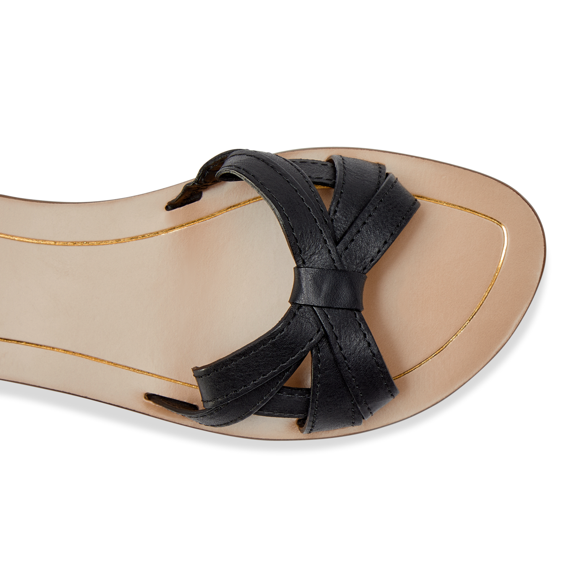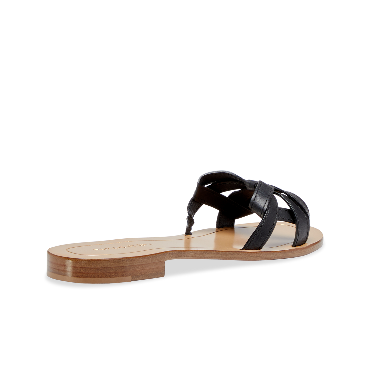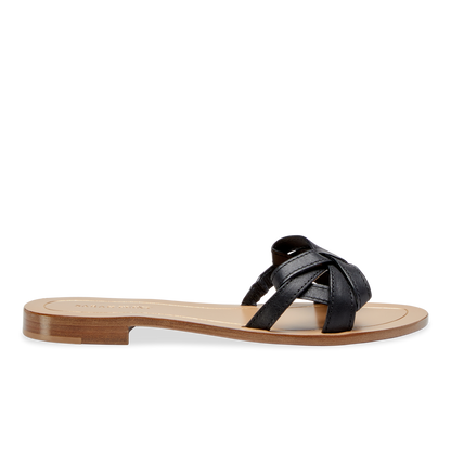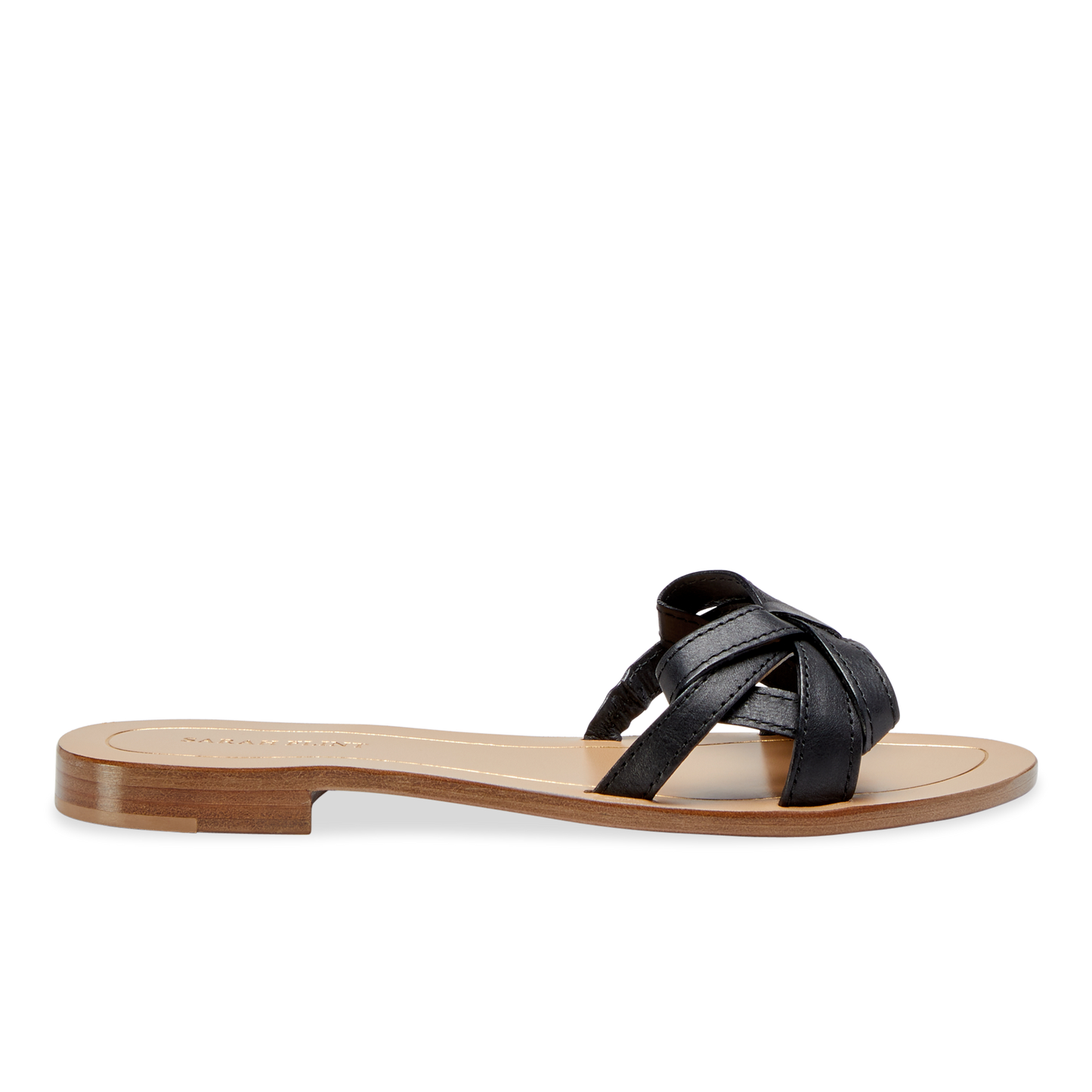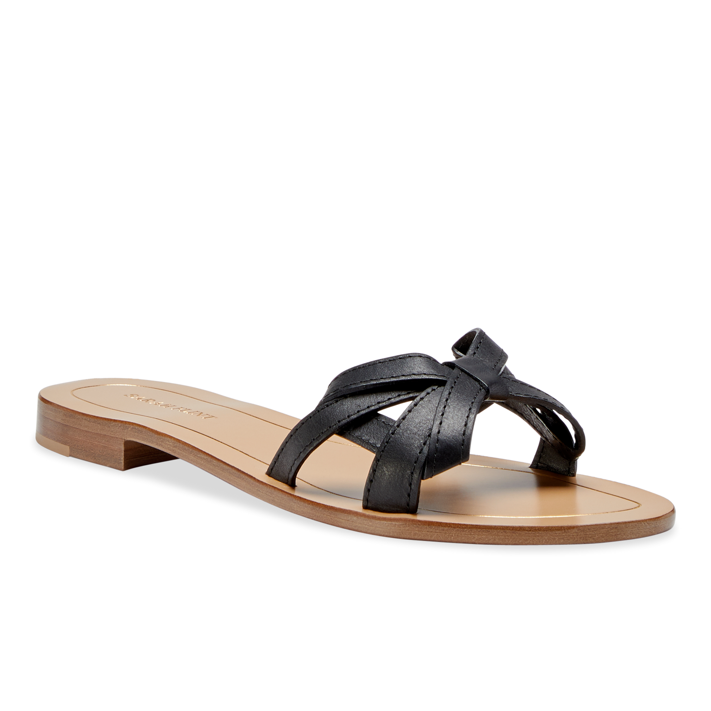 A breezy slide sandal in black vachetta, featuring an intricate, interwoven bow.