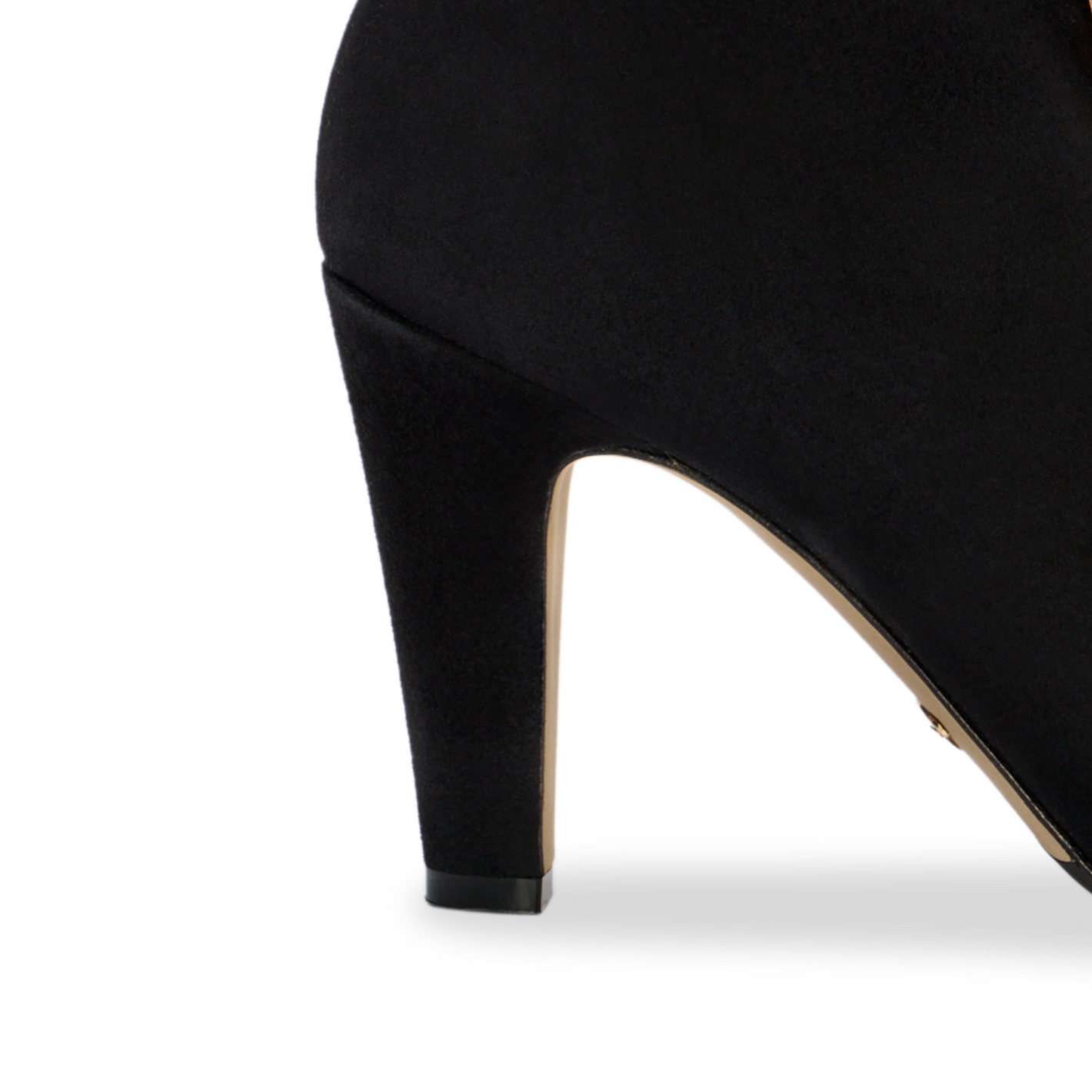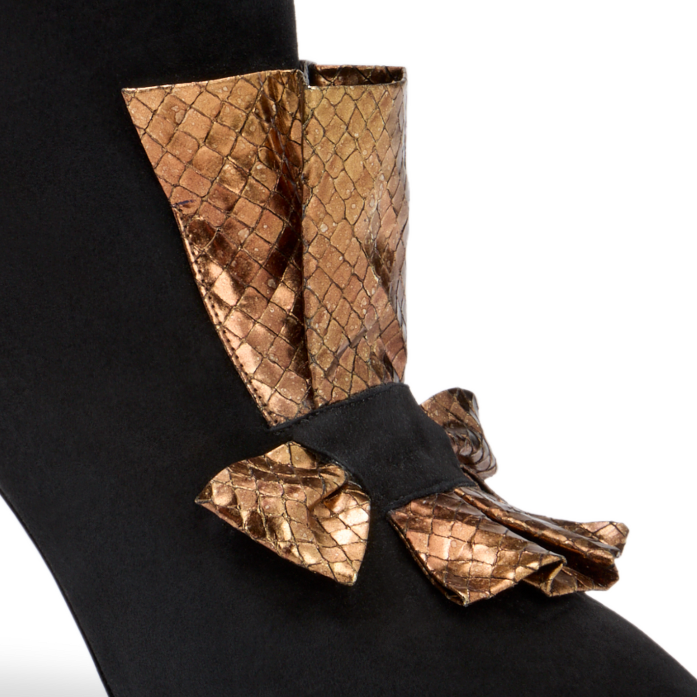 The Perfect Abigail Bow Bootie in Black Suede and Gold Embossed Leather in a 90mm bootie is perfect for special occasions, with a comfortable hidden platform.
