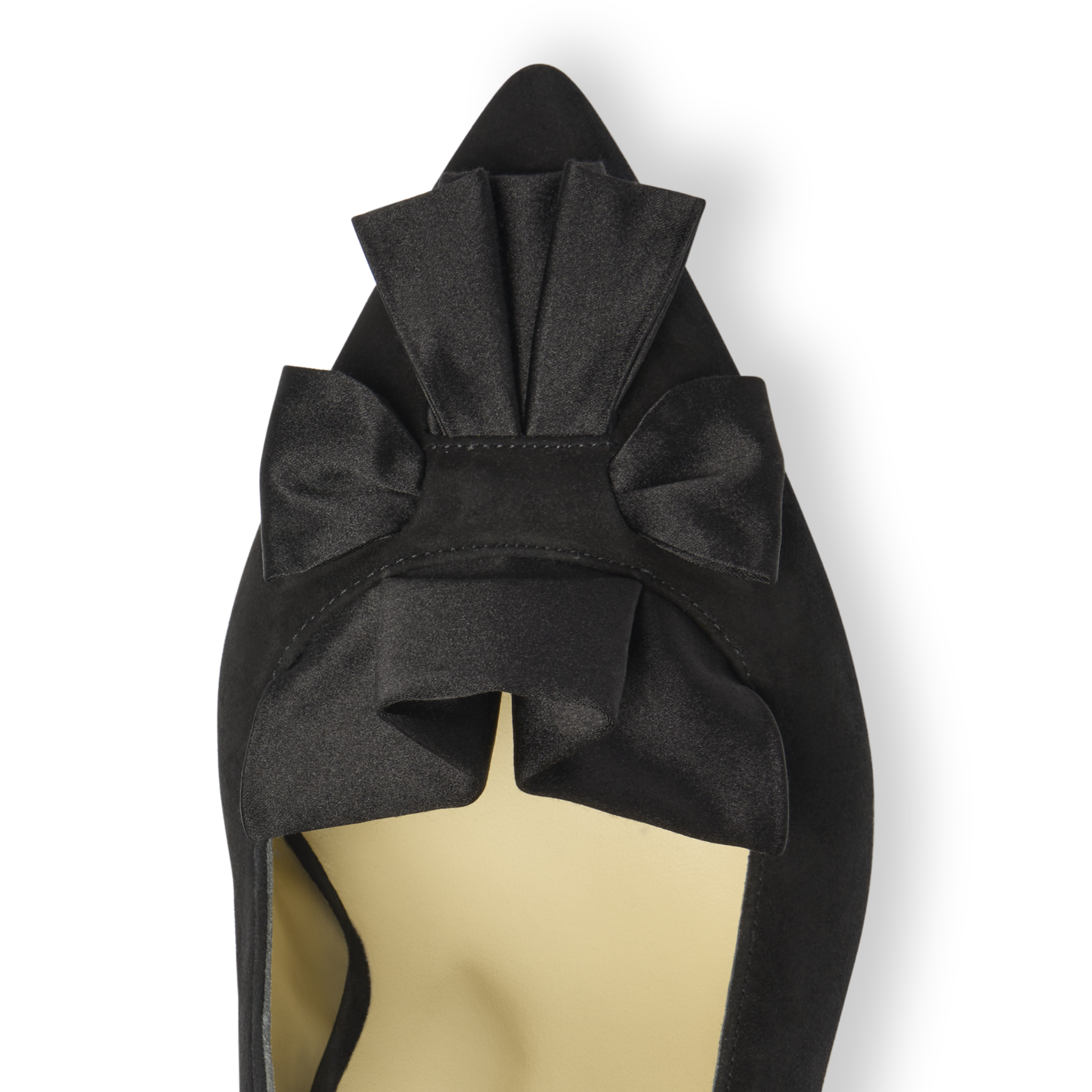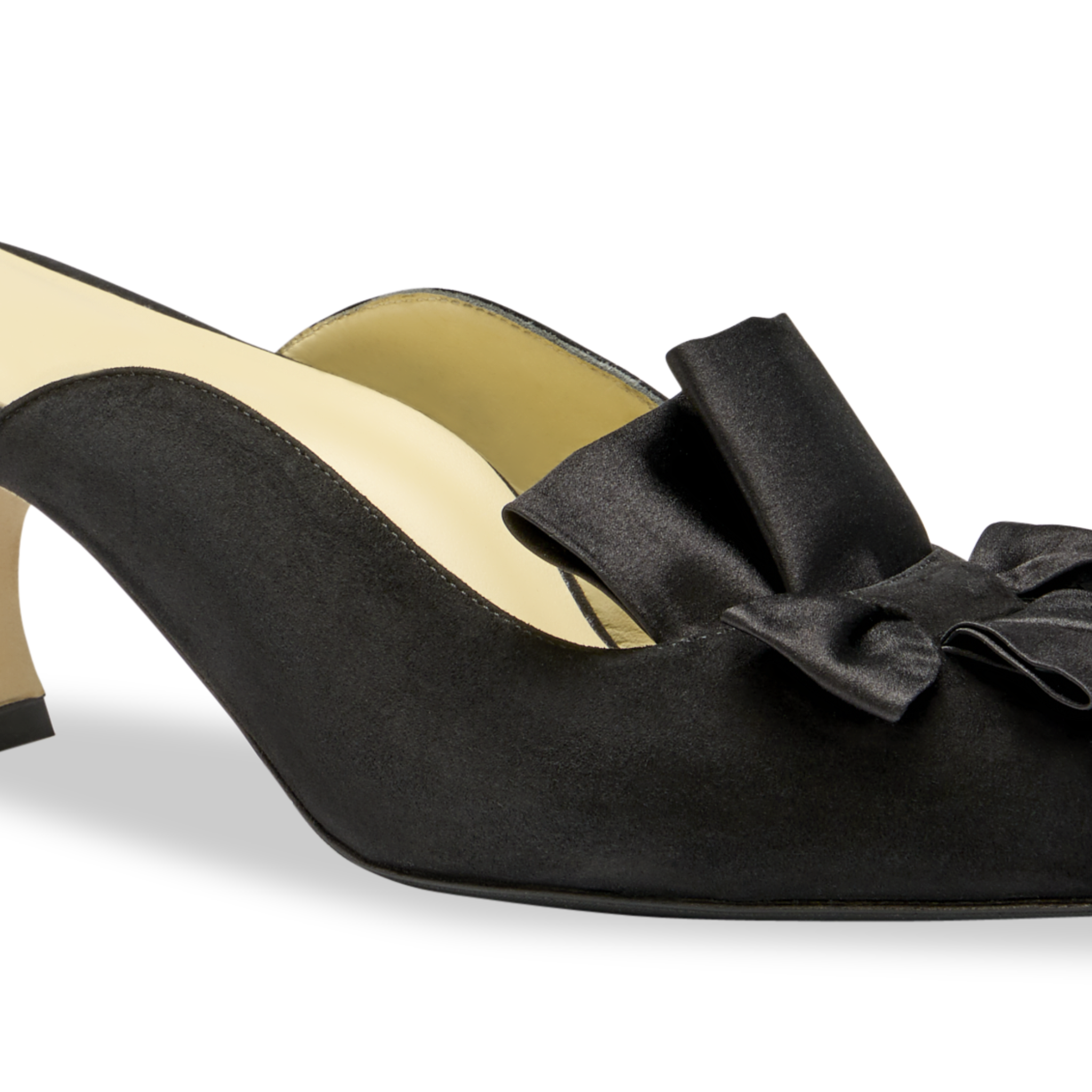 A burgundy jacquard kitten mule with an embossed leather bow at the vamp.