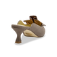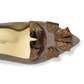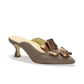 A mocha suede kitten mule with an embossed leather bow at the vamp.