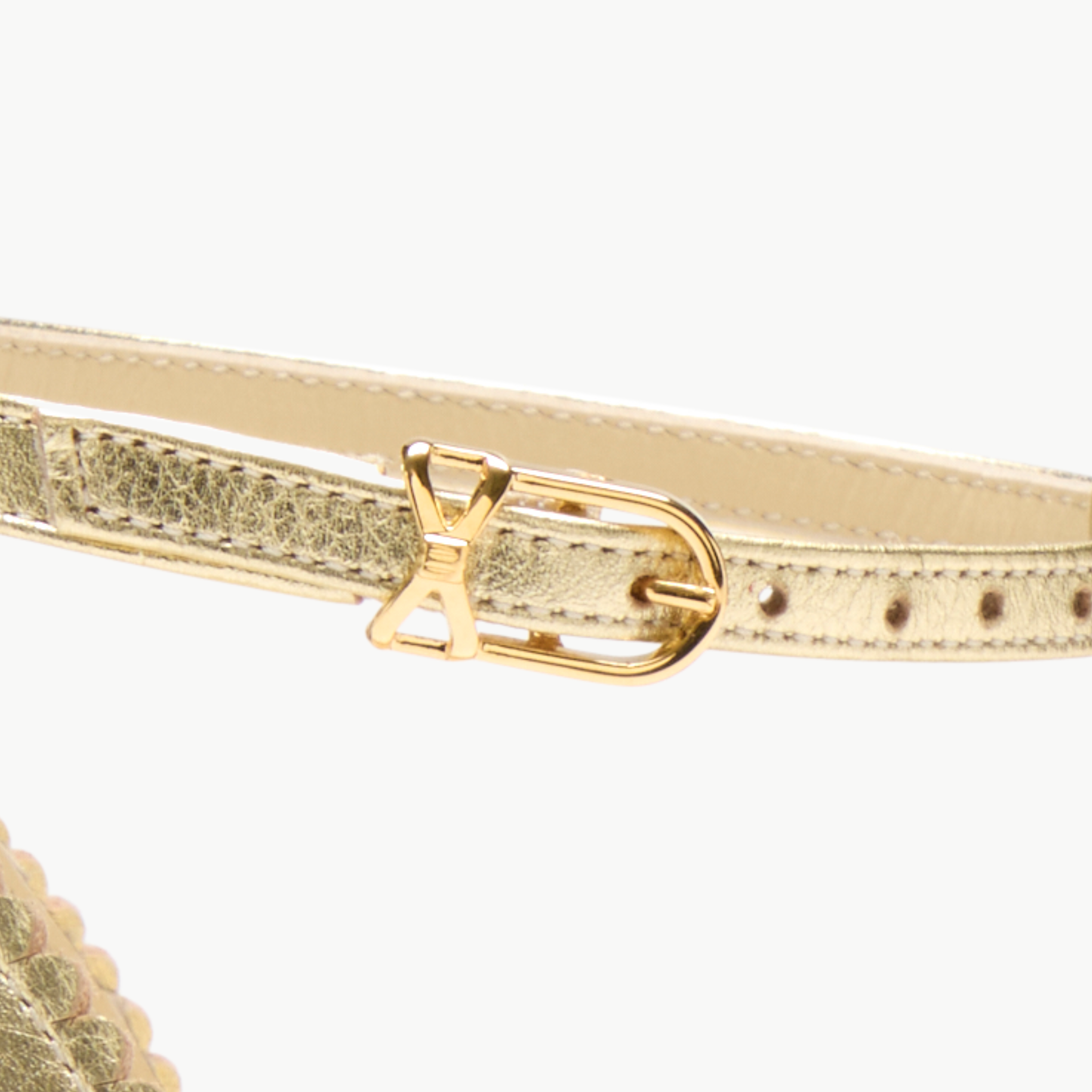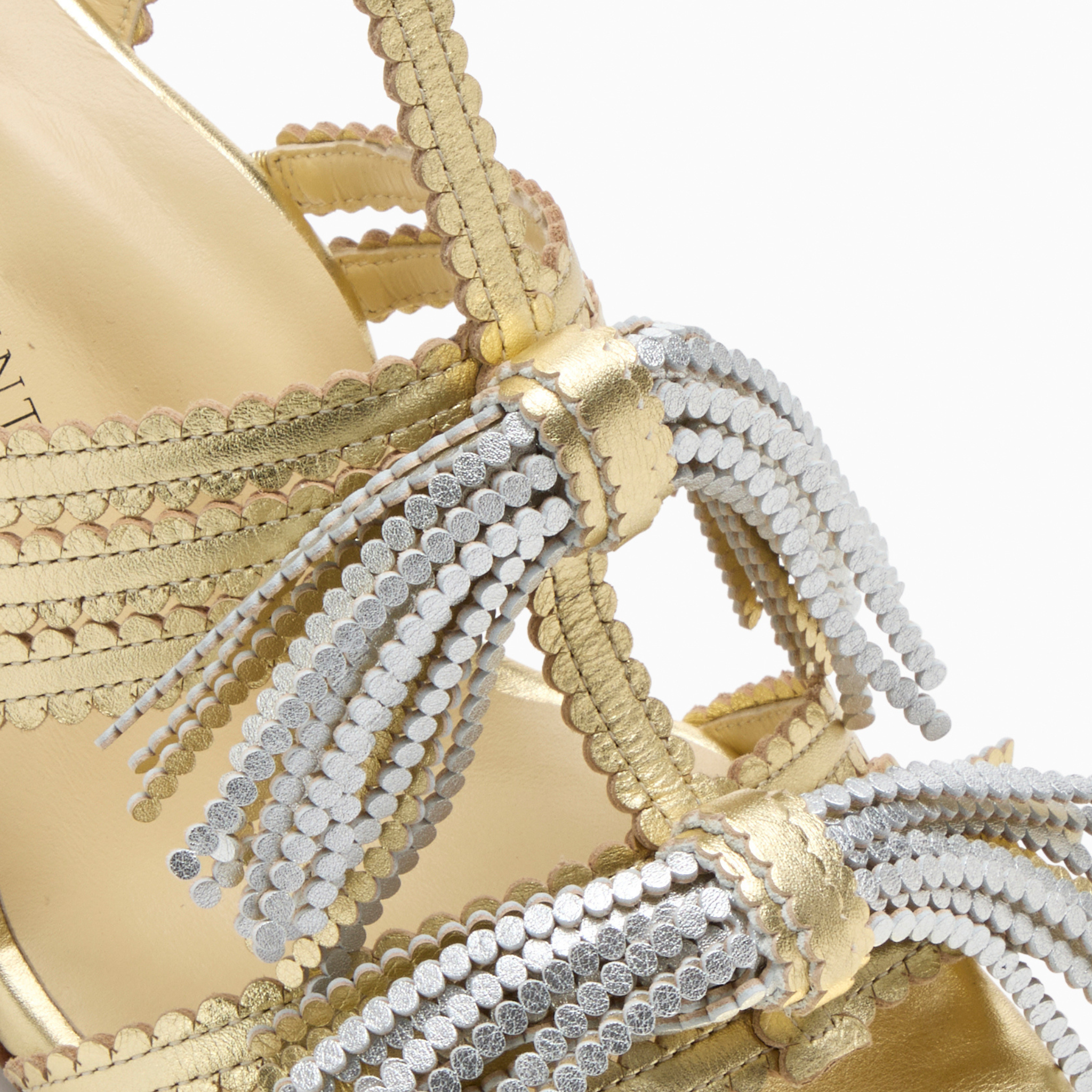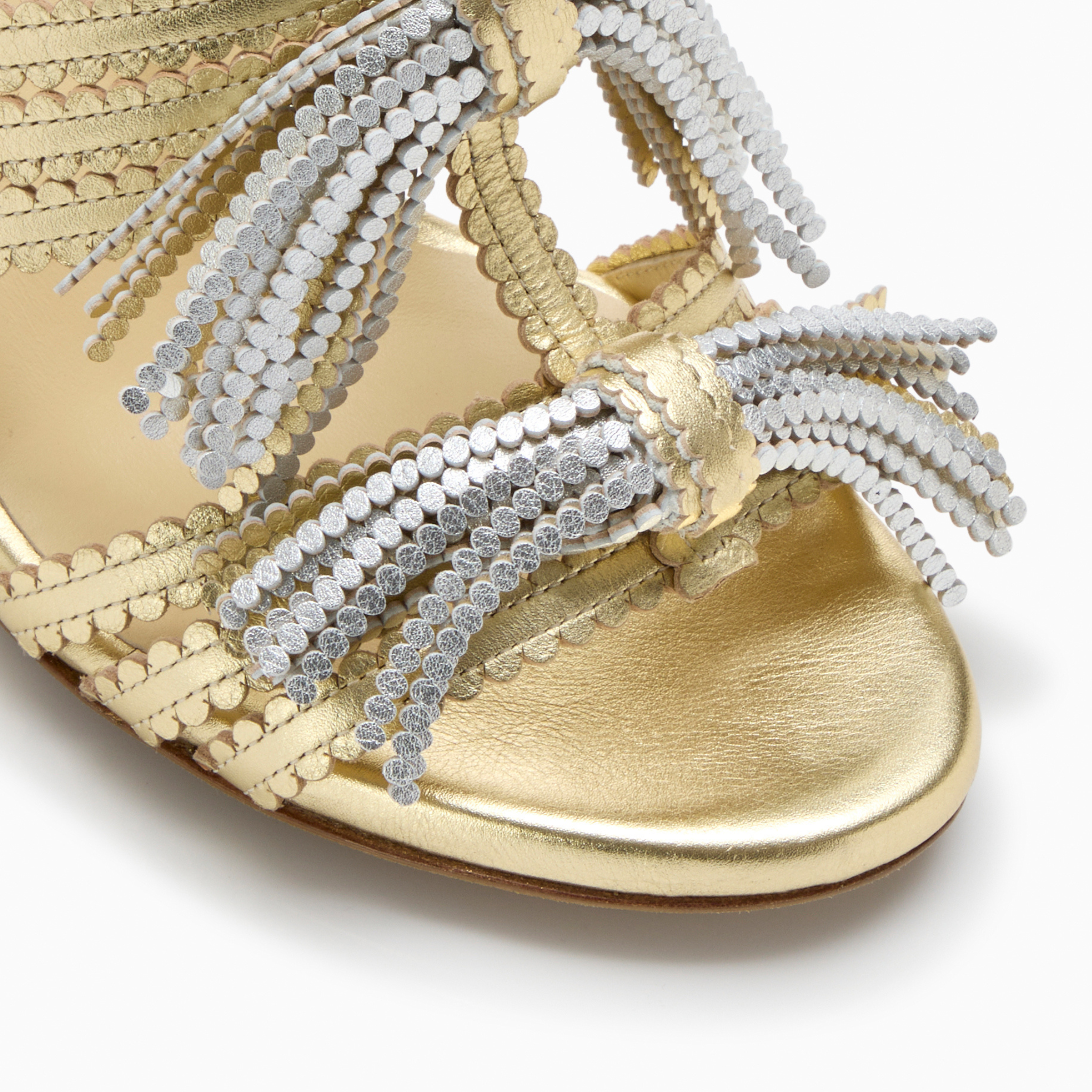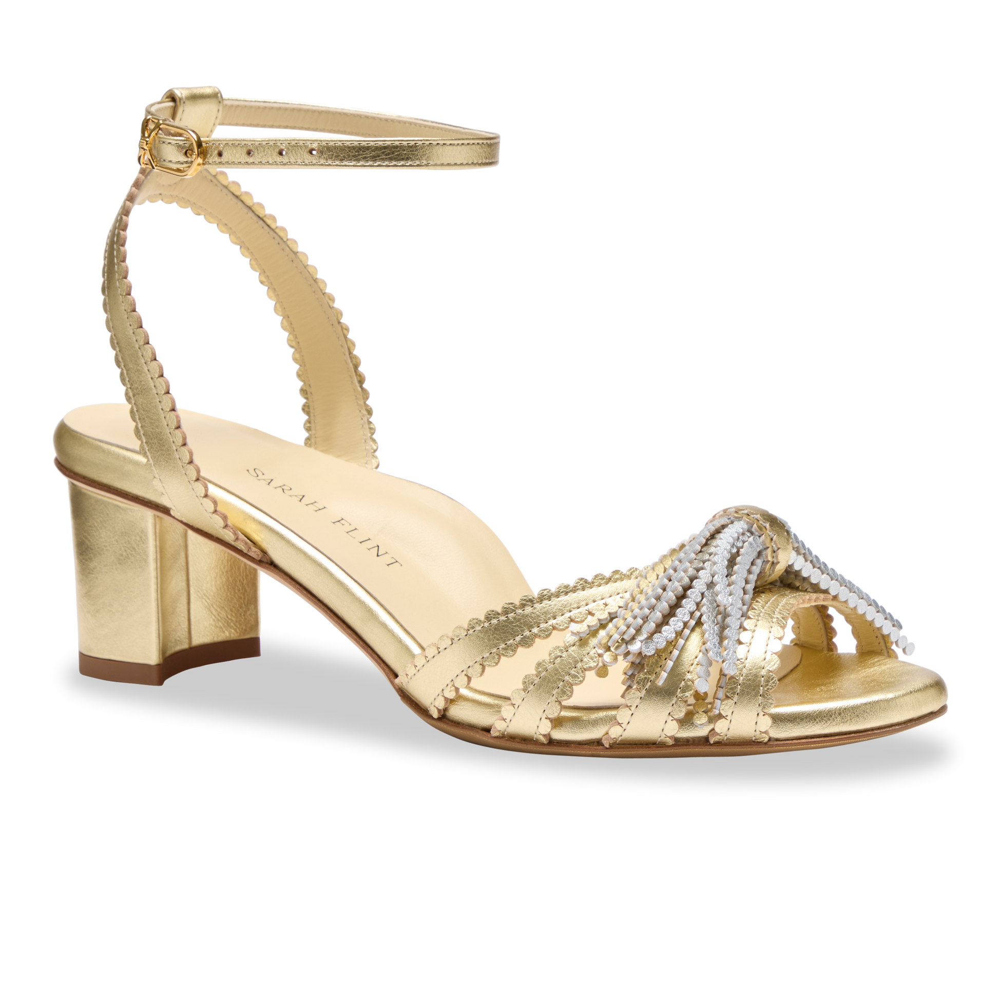 An open-toe sandal with a 50mm block heel and two-tone tassel in warm gold calf.