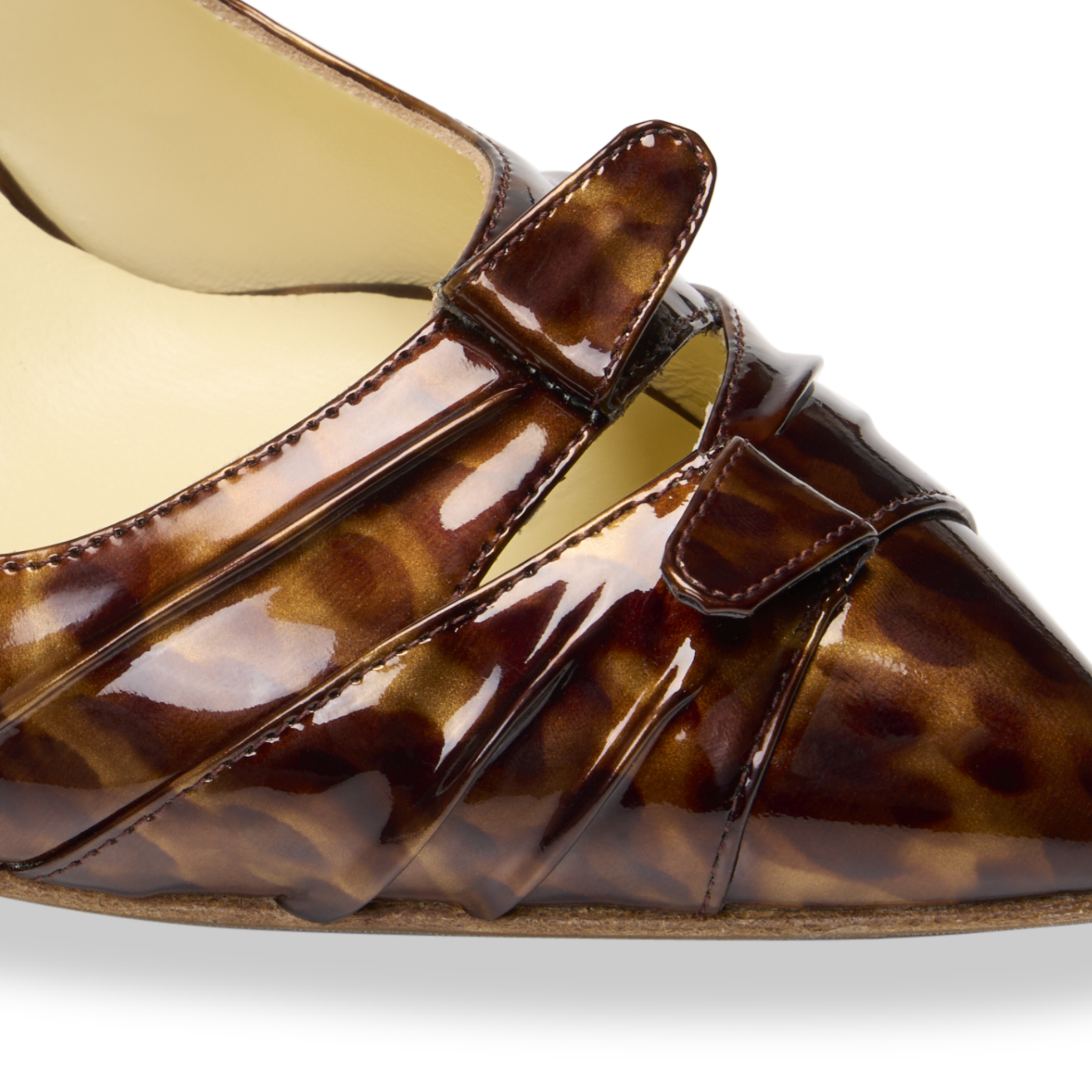 A sleek, block-heel pump in stone grey suede, crafted with origami-inspired pleating and a signature bow buckle ankle strap.
