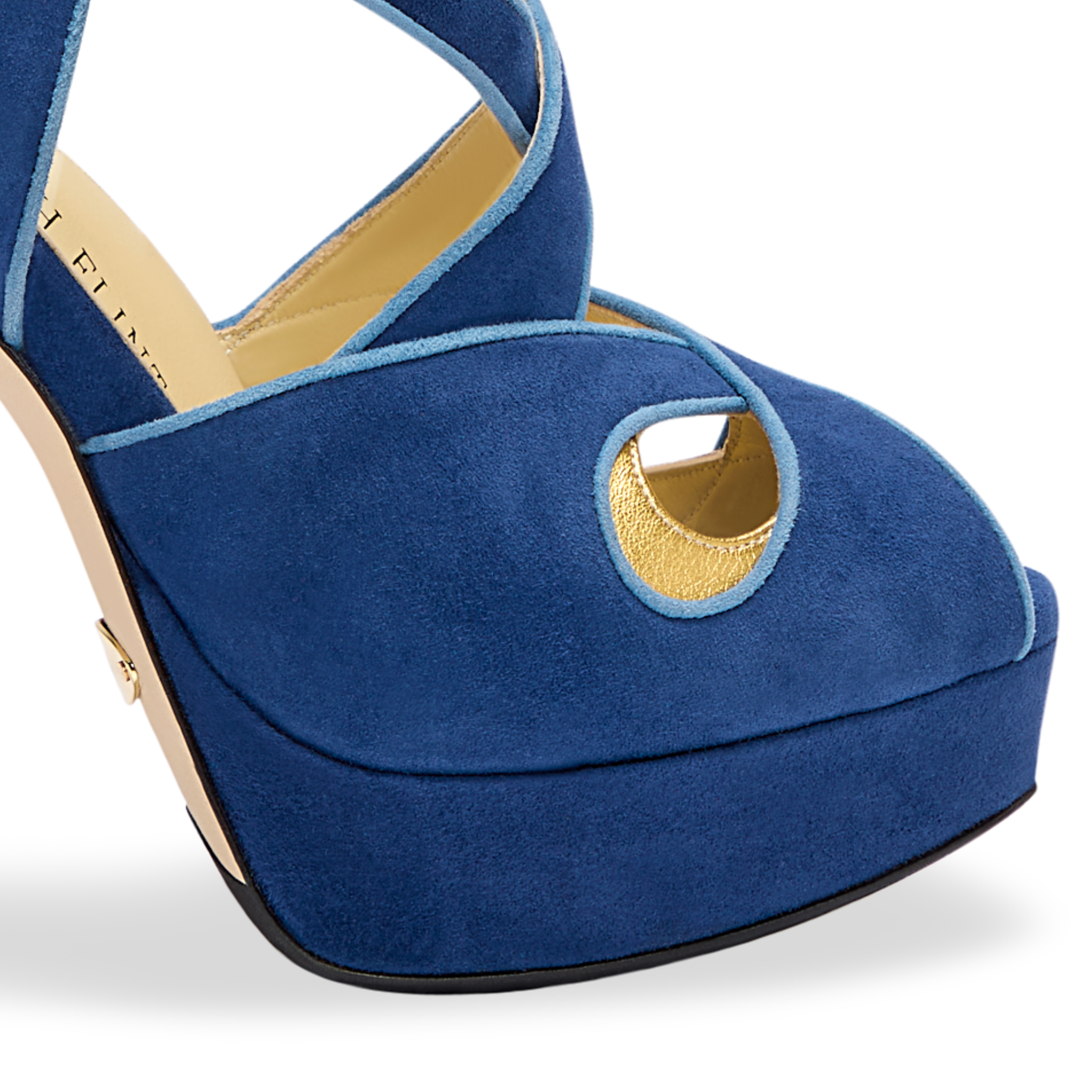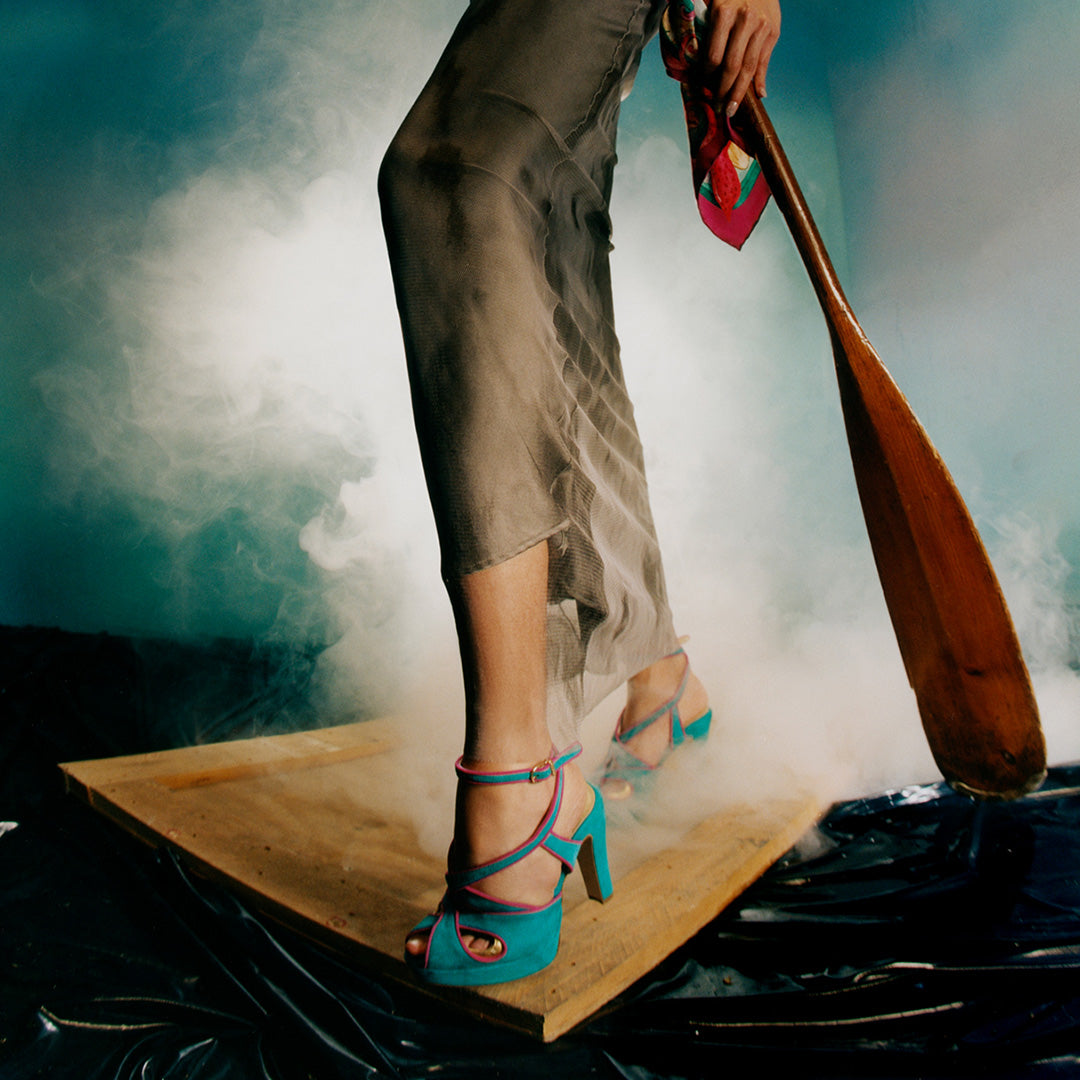 A party-ready style in turquoise suede, this platform heel features intricate pattern work and eye-catching cutouts.