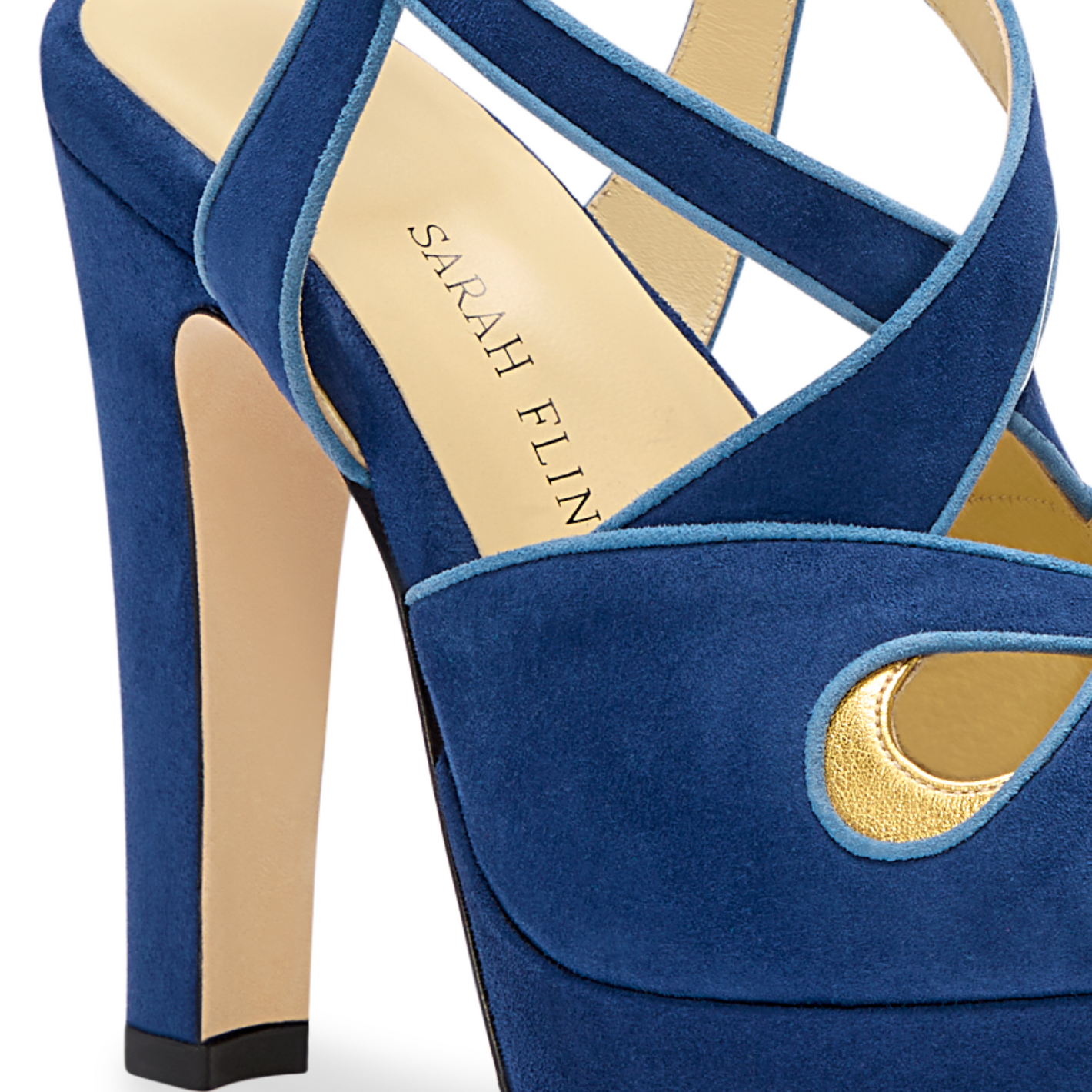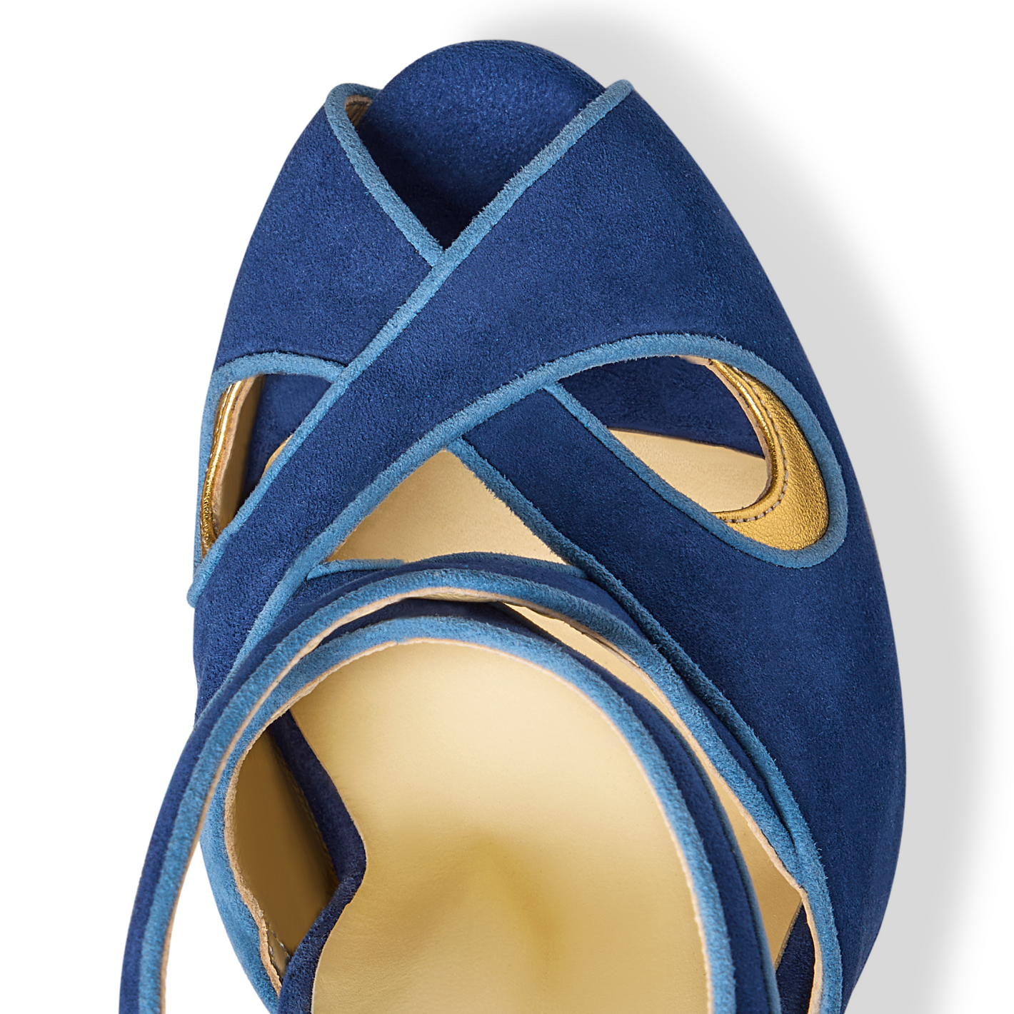 Peekaboo cutouts trimmed with gold nappa crescents