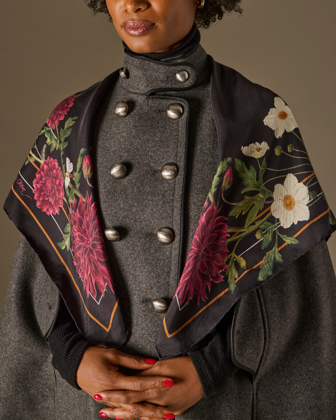 Exclusively part of the Sarah Flint x Mary Orton collaboration, this limited edition Bordeaux Floral Scarf features original handpainted artwork by Libby Bell. Autumnal florals including burgundy dahlias, white anemones, berries, and fern-like greens appear against a striking black background, blending natural beauty with structured geometry. Handmade in Lake Como, Italy from 100 percent silk, it is a story rich, versatile accessory perfect for adding a timeless accent to any outfit.