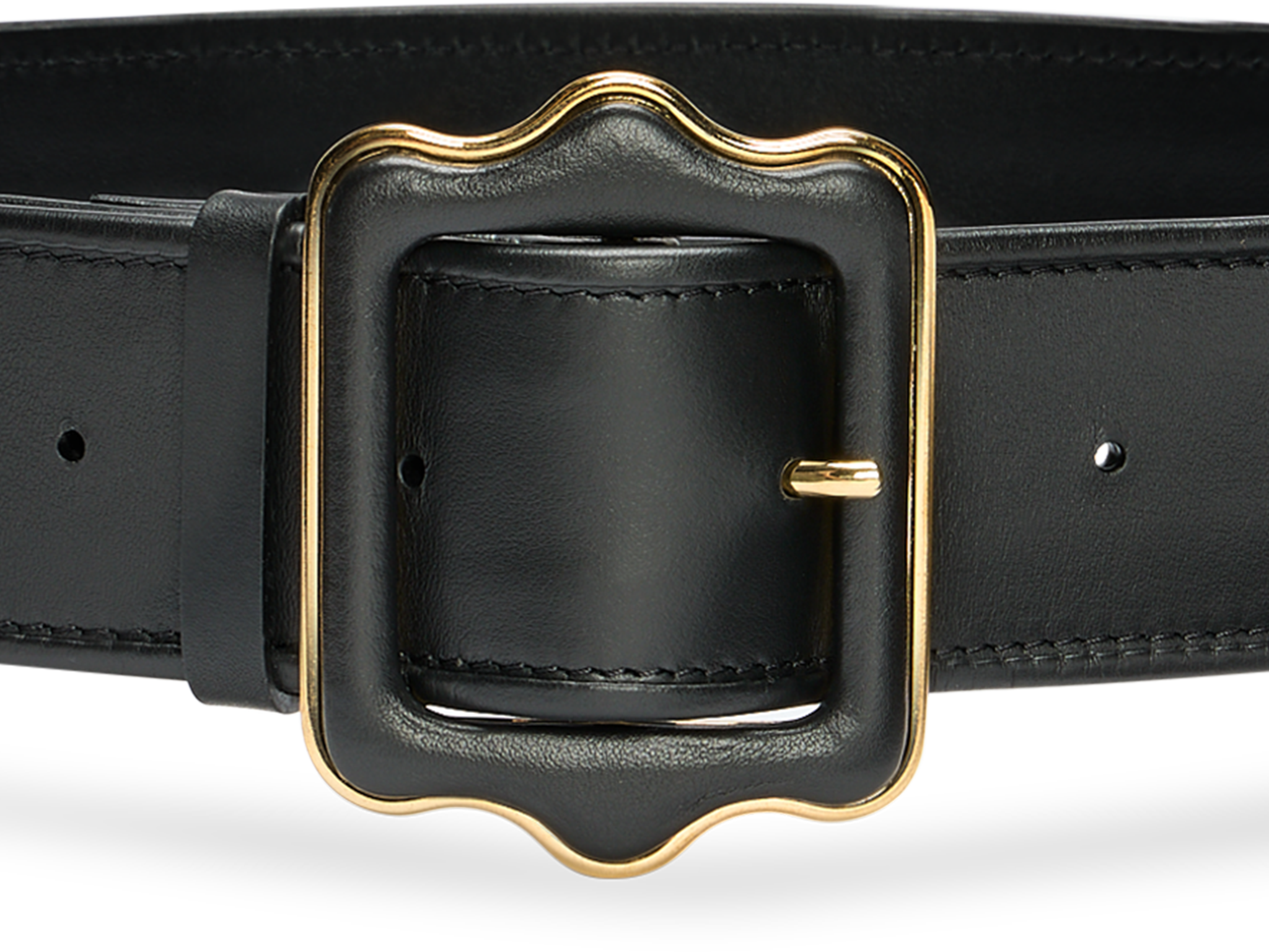 Our Vienna Waist belt is complemented by a leather-covered buckle adorned with scalloped gold-tone hardware, mirroring the elegant scalloped detailing along the belt's edge. With five adjustment holes, it offers a customizable fit for enhanced comfort and style. A double loop design ensures the buckle edge stays securely in place throughout the day.